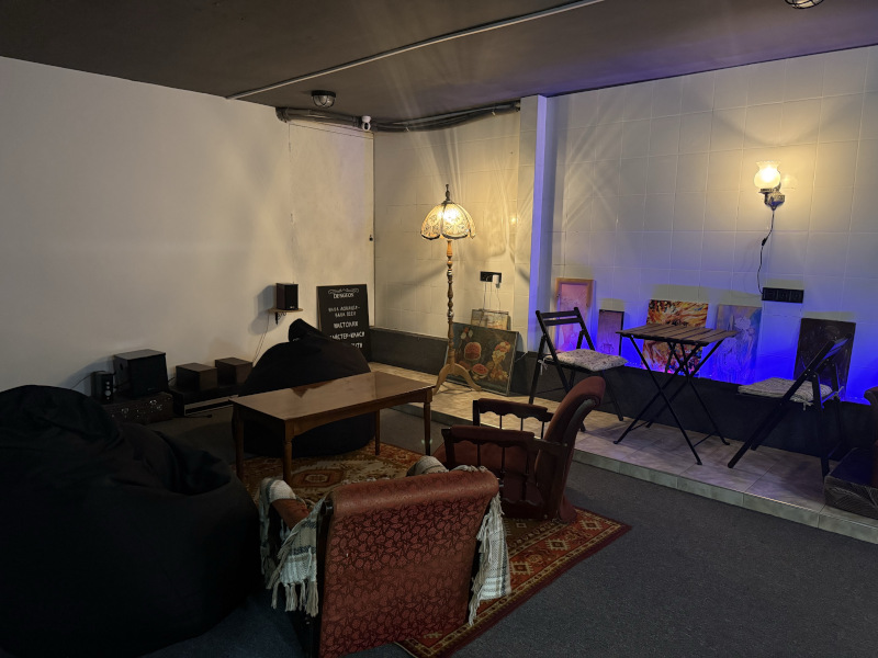 Внизу знаходиться простір із килимами, диванами, подушками. Певно, тут класно влаштовувати книжкові клуби чи камерні читання. Простір здається в оренду для таких форматів, тут є сцена, проєктор, колонки.