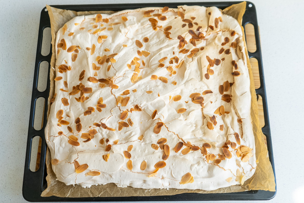 Деко накриваємо папером для випікання — попередньо можна його зім’яти, поверх рівним шаром розподіляємо меренгу. Посипаємо мигдалевими пластівцями і ставимо в духовку, яка вже розігріта до 150 градусів. Випікаємо без конвекції 25-30 хвилин.