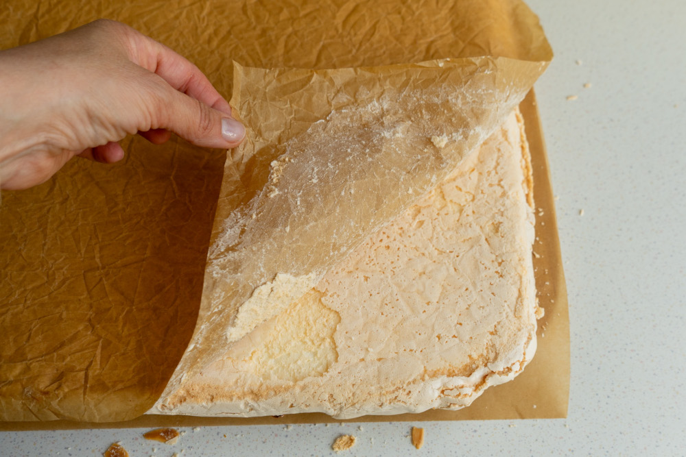 Дістаємо, накриваємо ще одним аркушем пергаментного паперу й перевертаємо на велику дошку — не залишаємо на металевому деку, бо триватиме процес нагрівання меренги, що призведе до її пересихання.