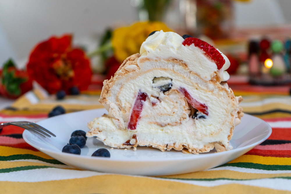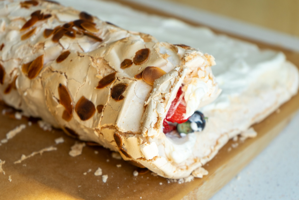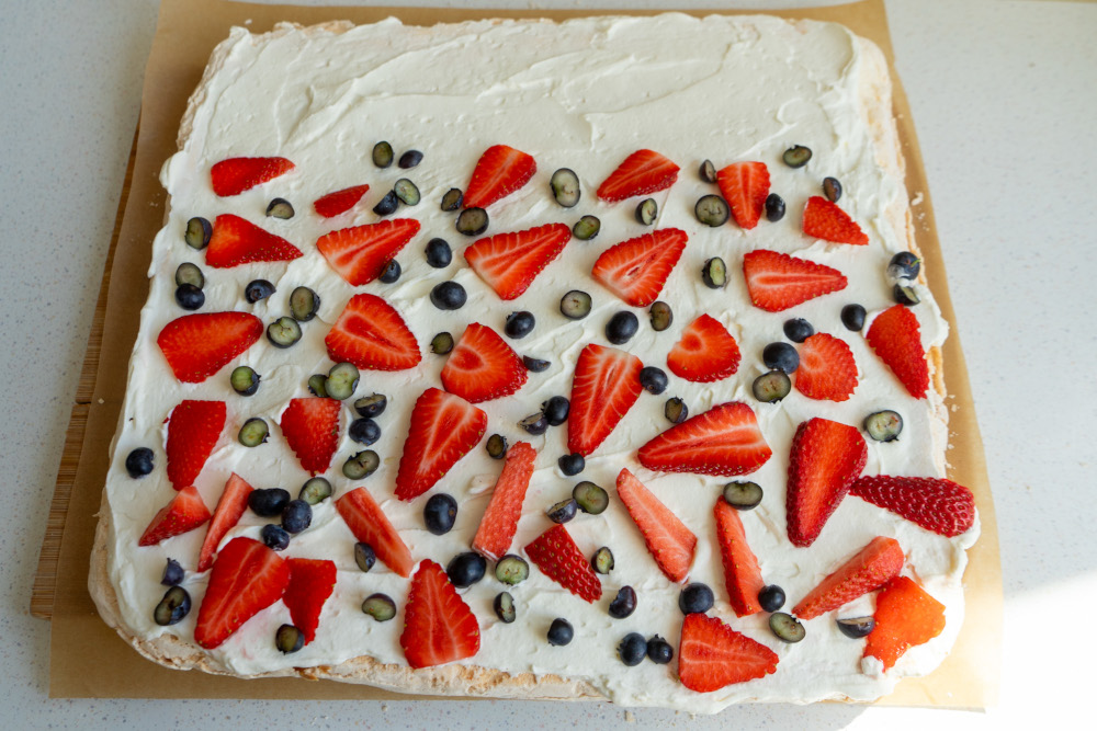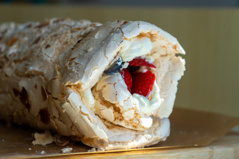 Обережно знімаємо папір, на якому рулет випікався. Рівним шаром розподіляємо по мерензі ¾ частини крему, розкладаємо половину ягід. За допомогою паперу згортаємо меренгу в рулет. Кремом та ягодами, що залишилися, прикрашаємо десерт.