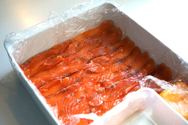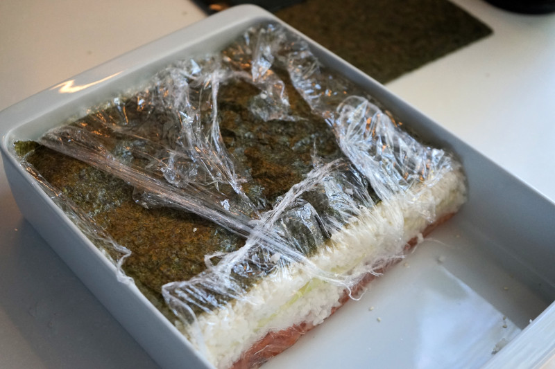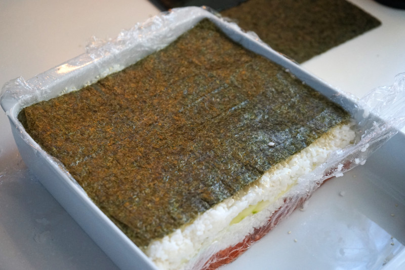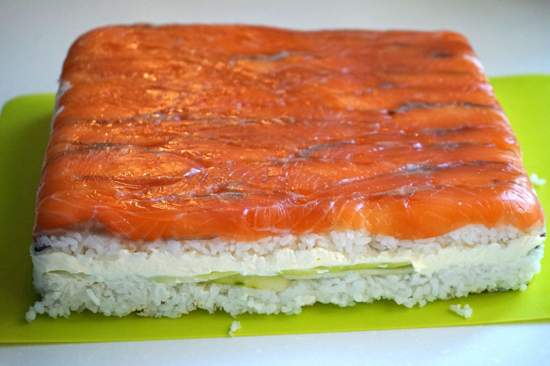 Шари в суші-торті складаються у зворотному порядку: спочатку верхній, наостанок той, що буде в основі. Отже, я красиво виклала рибу, рівним шаром утрамбувала половину рису, накрила листом норі, змастила сиром «Філадельфія», додала огірки, знову прикрила все норі, далі закінчила рисом та ще одним листом норі.