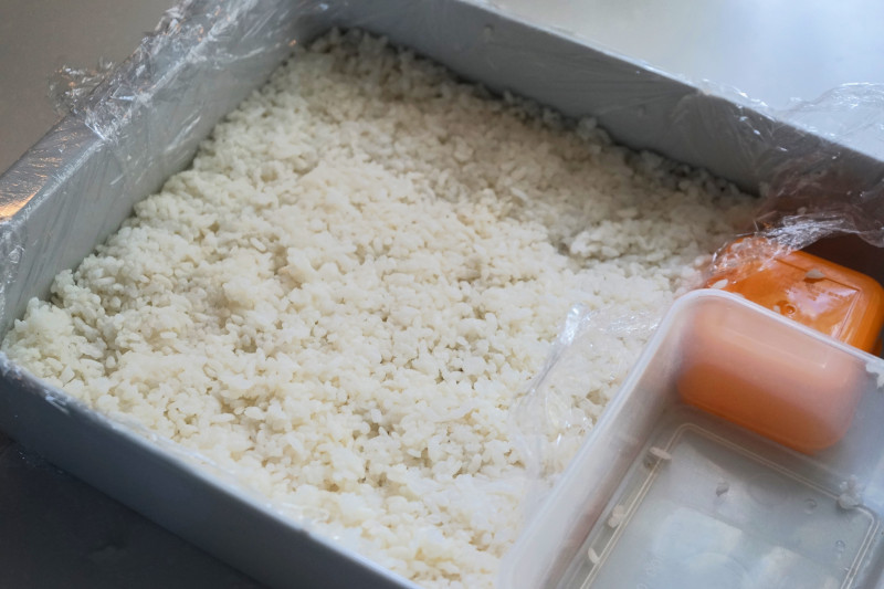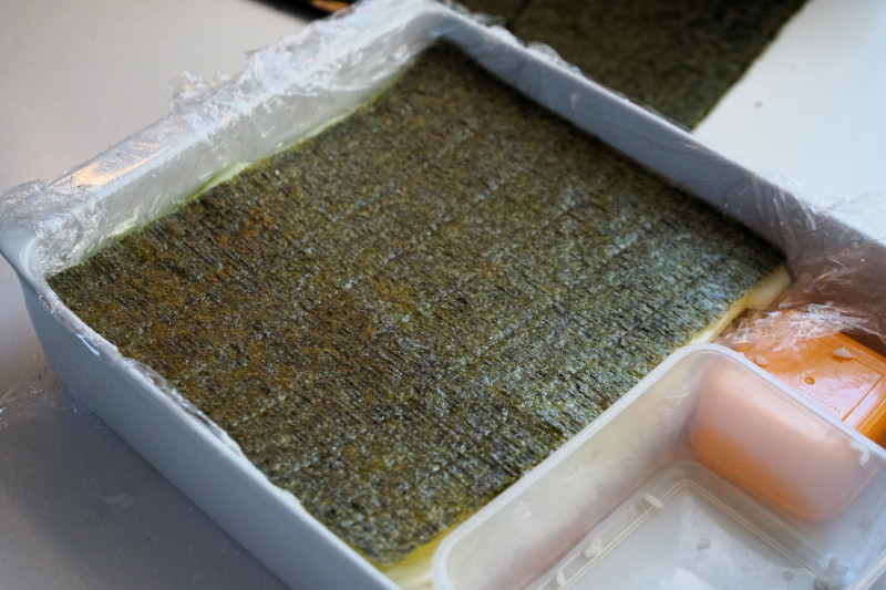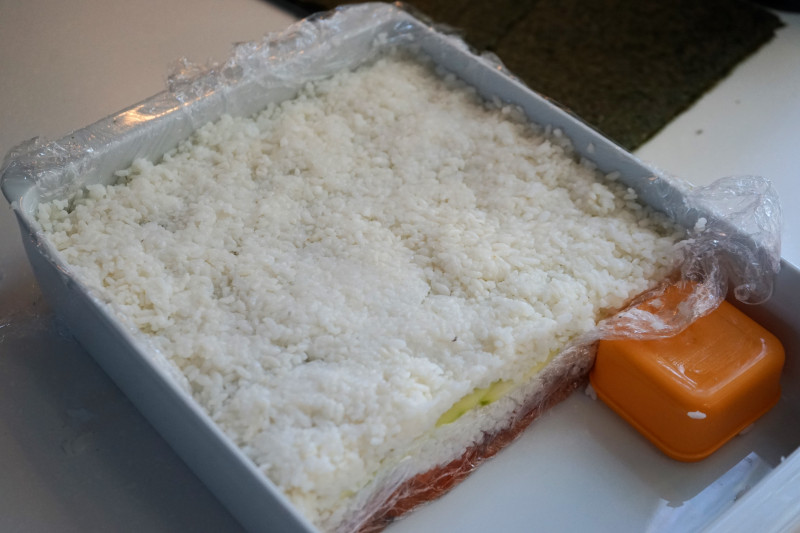 Під рукою не було прямокутної форми потрібного розміру, а круглі суші-торт я не люблю готувати, бо потім не дуже зручно нарізати порційними шматочками. Тому я взяла якусь форму для запікання, а підручні матеріали (лоточки, інші тарілки, піали тощо) використала як обмежувачі.