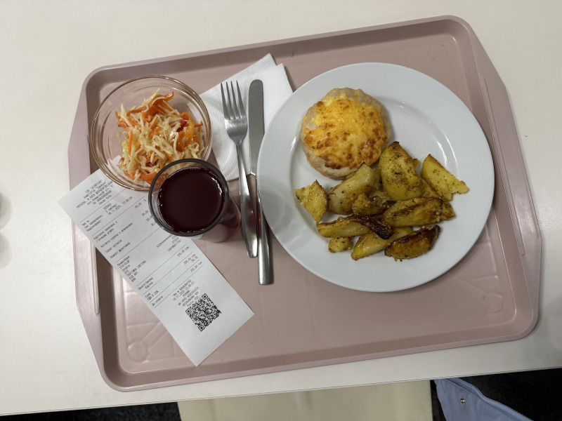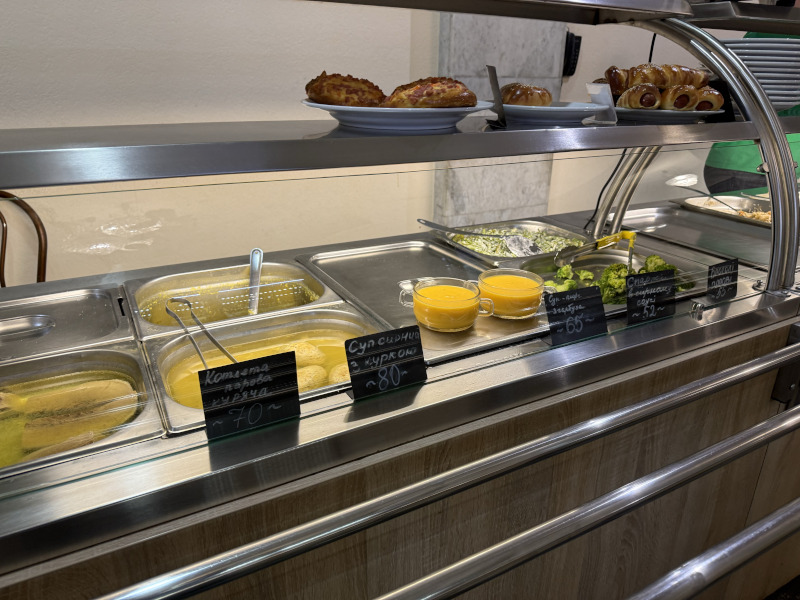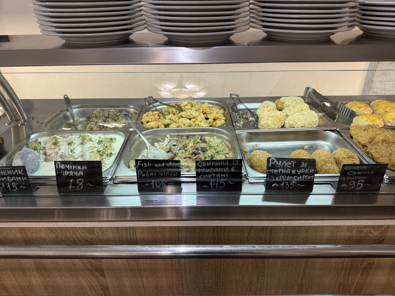 Процес стандартний, як у більшості їдалень: ідеш із тацею повз стійки зі стравами та обираєш. Є супи, м’ясне та рибне, салати, гарніри, напої. Також чай, кава, десерти, млинці. Останні ми пізно побачили, тому не куштували і трохи засмутилися.