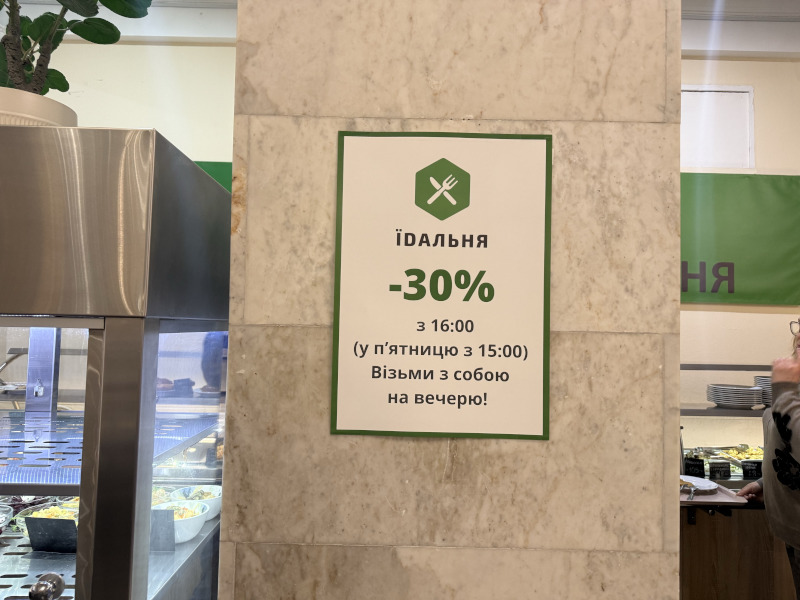 Їдальня працює з понеділка до п’ятниці з 08:30 до 17:00, в п’ятницю — до 16.00. За годину до закриття можна купити їжу з собою зі знижкою 30%. У вихідні їдальня не працює.