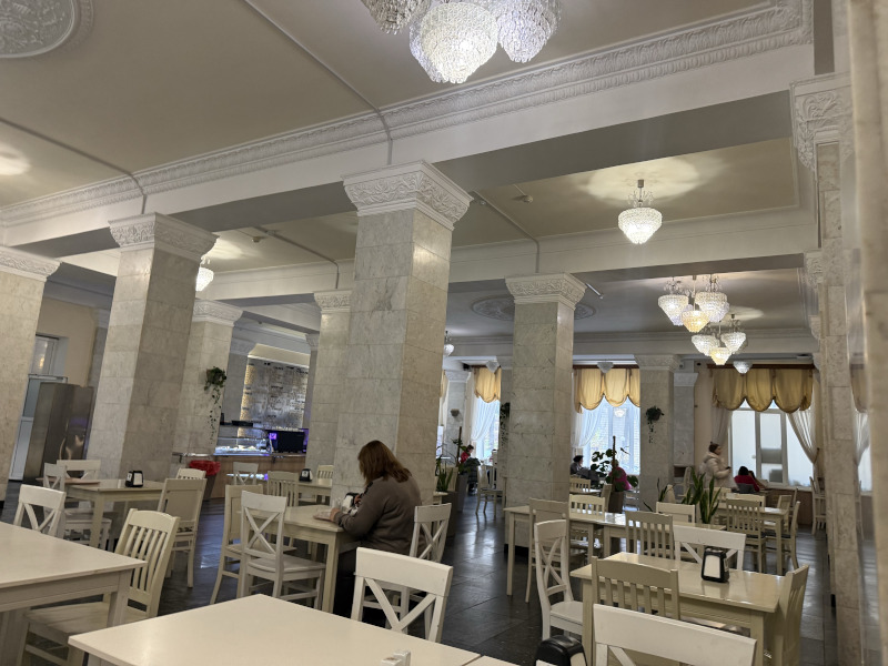 Підіймаєтеся сходами, проходите крізь кав’ярню з вайбом вокзальної, потрапляєте до білої зали з колонами. Вітаннячка — ви на місці.