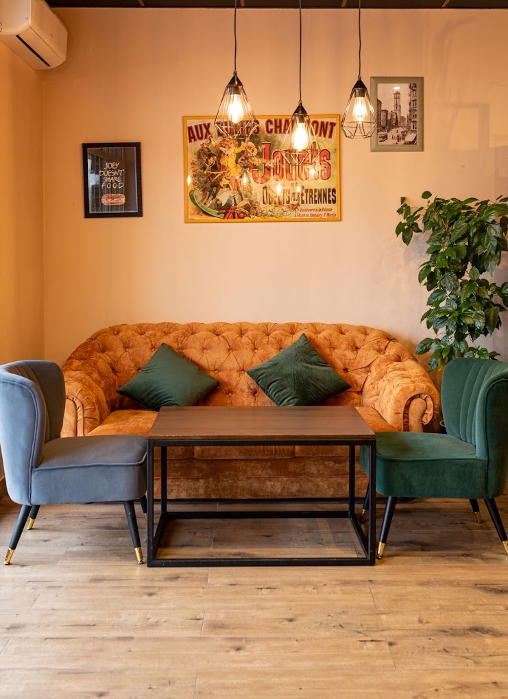 На вході зустрічає велика вивіска, стилізована під логотип серіалу. Всередині два зали: перший — яскравий, із помаранчевими диванами та теплим освітленням. На стіні — телевізор, де нон-стопом показують «Друзів». Другий — із темно-зеленими диванами та серіальними постерами. У кутку стоїть культовий жовтий диван — копія того самого, який Росс Геллер безуспішно намагався занести у свою квартиру. Є також дитячий куточок із книжками, розмальовками та конструктором. Є й настільні ігри для дорослих. Заклад pet friendly.