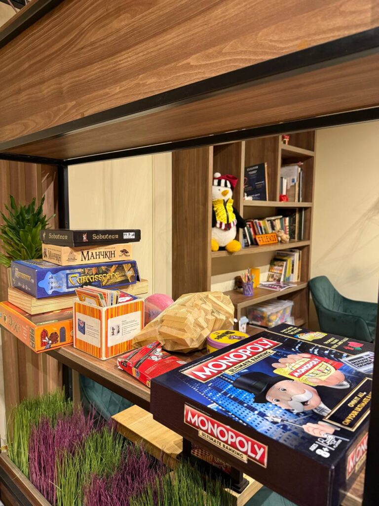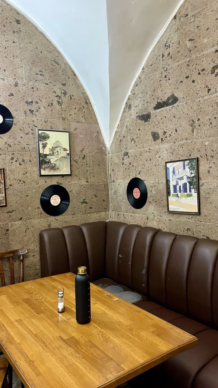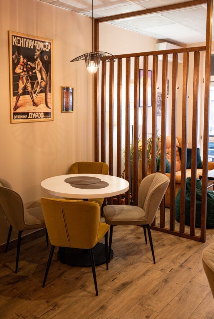 Інтер’єр відповідає творчому вайбу: на стінах висять вінілові платівки, фотоколажі з кадрами відомих фільмів і портрети режисерів. Біля вікна стоїть піаніно.