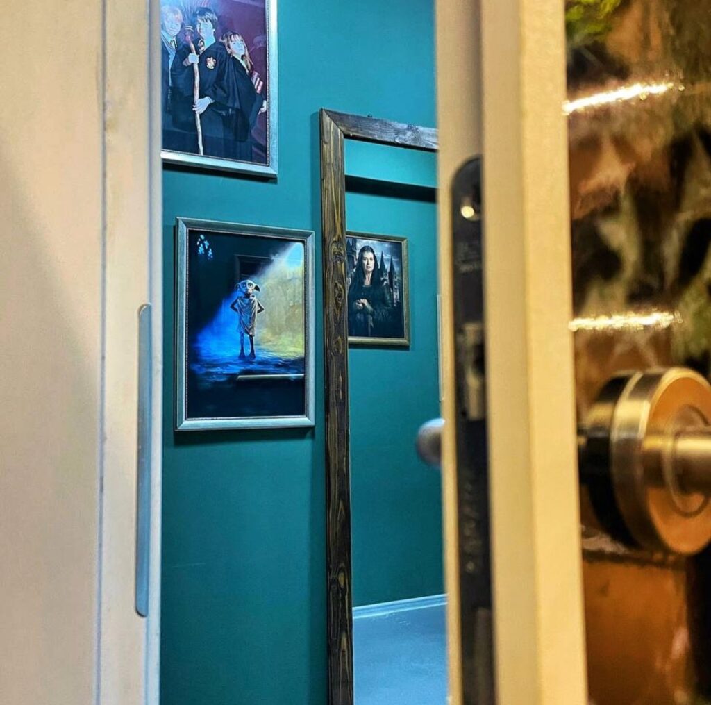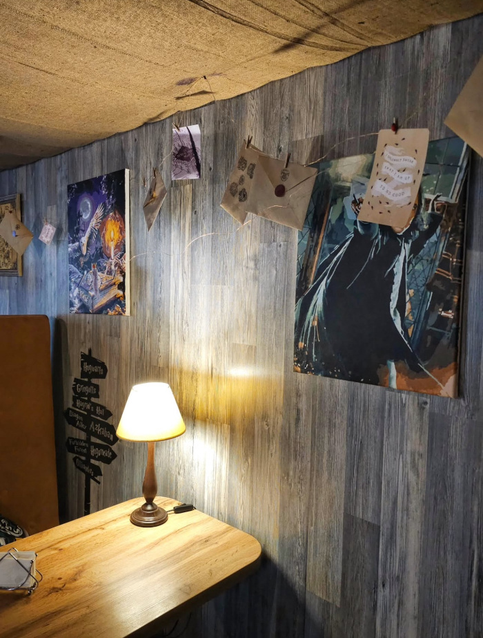 Інтер’єр нагадує кімнату шанувальника — на стінах постери з персонажами, картини Гоґвортсу, розвішані листи, стоять книги та мітли. Є сортувальний капелюх, який можна приміряти для фото.