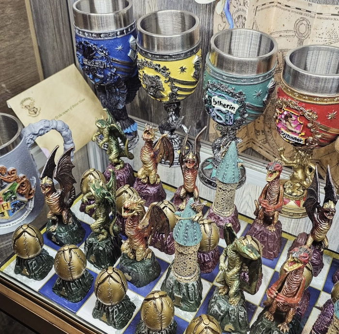 Навколо барної стійки вітрини з тематичними дрібницями: фігурки персонажів різних розмірів, настільні ігри, декоративні келихи, свічки, статуетки. Здається, щоб розглянути це, потрібні години.