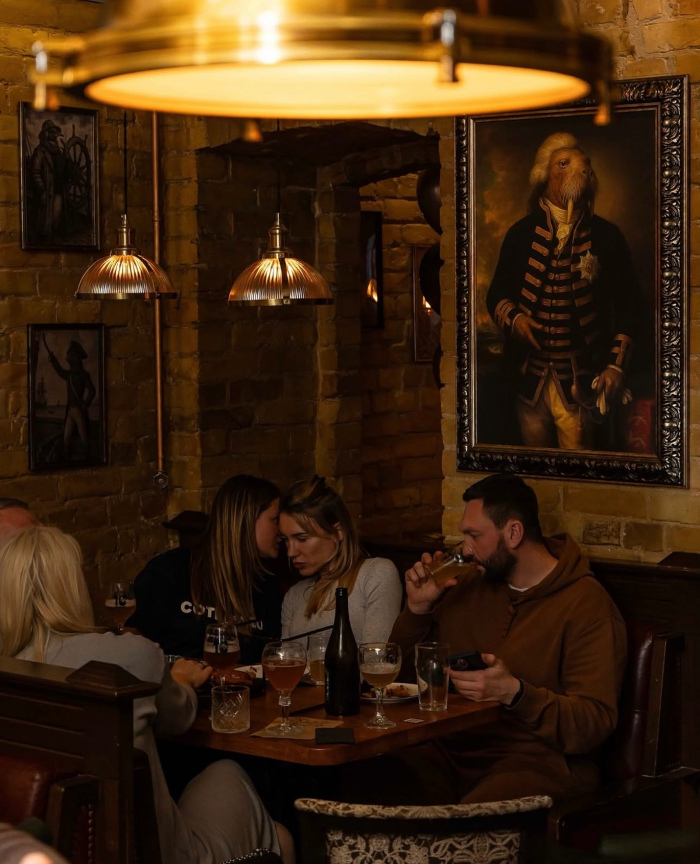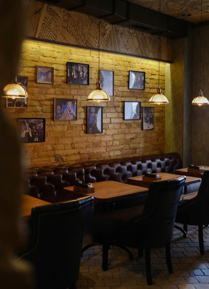 Новенький паб «The Gentlemen» теж має кіношний вайб. Тут поєднали стриманий англійський стиль пабів із легкою хуліганською іронією, як у фільмі Гая Річі. Заклад має два зали, які символізують дві сторони однієї історії: перший — The Gentlemen’s Room — класичний англійський зал із теплим деревом, м’яким світлом і баром, де на полицях стоять колекційні пляшки і кадри з фільму. Другий — The Garden by Ritchie — більш сучасний простір у стилі фільму «The Gentlemen»: неонове світло, декоративна плантація марихуани, більярд і кілька цікавих артоб’єктів, які можна фотографувати.