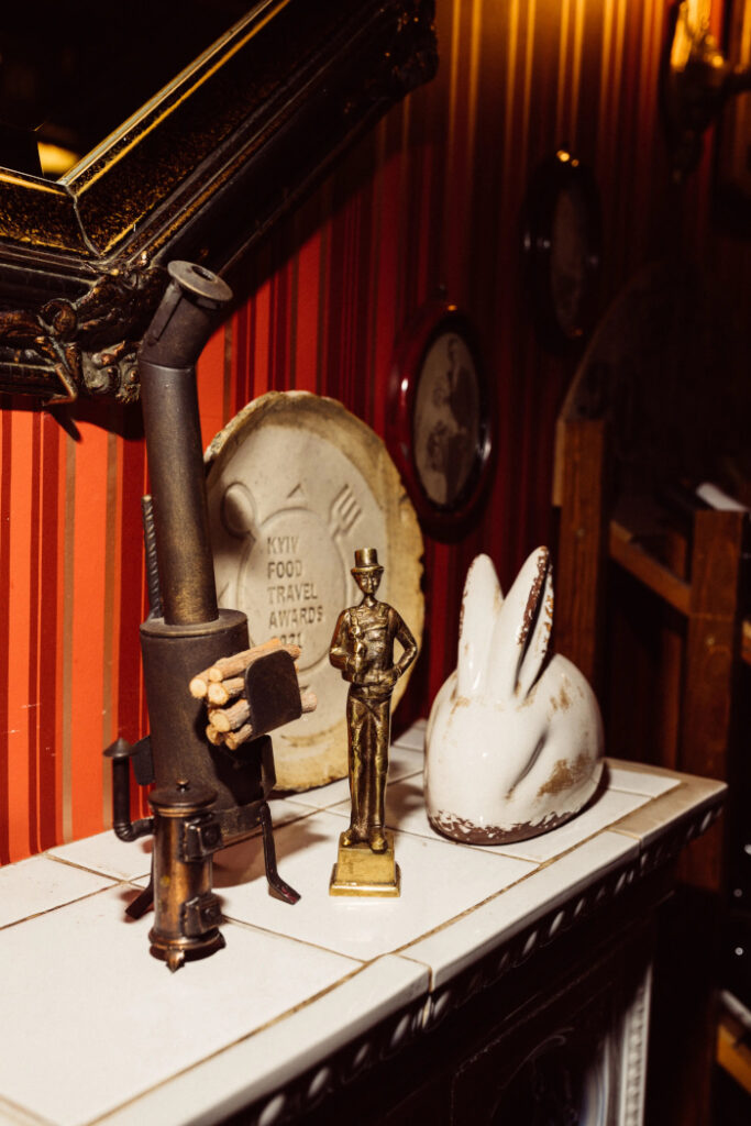 Серед деталей — старі театральні програми, фотографії зі зйомок фільму «За двома зайцями», порцеляна, одяг київських модниць і безліч артоб’єктів у формі зайців.