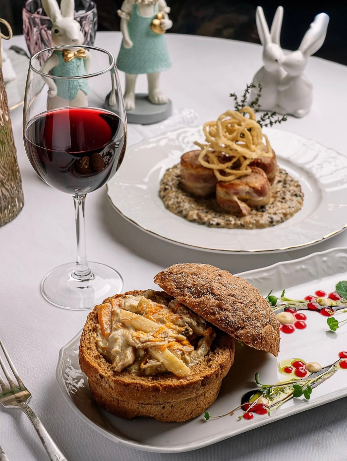 Меню продовжує загальну концепцію. Тут подають українські страви, частину продуктів замовляють у фермерів. Є позиції з м’ясом зайця та київські страви.