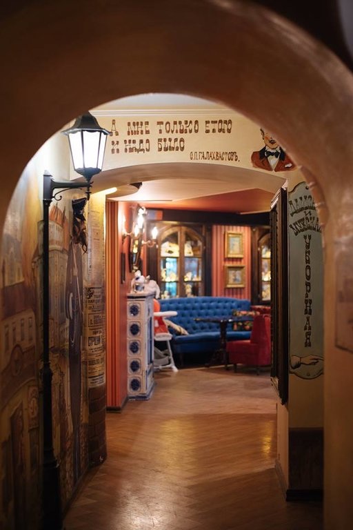 На стінах картини британських художників і кадри з кінострічки. У залі акцентні шкіряні дивани та розмальована стеля. У вихідні звучить жива акустика. Сюди, до речі, теж можна приходити з домашніми тваринами.
