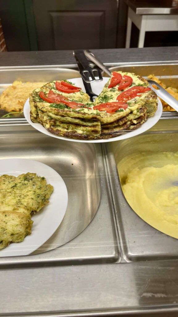 Меню класичне: перші страви, відбивні, гарніри, салати та закуски. Особливість — майже в кожну страву додають зелень, тож усе виглядає яскраво і «зелено».