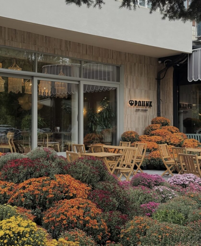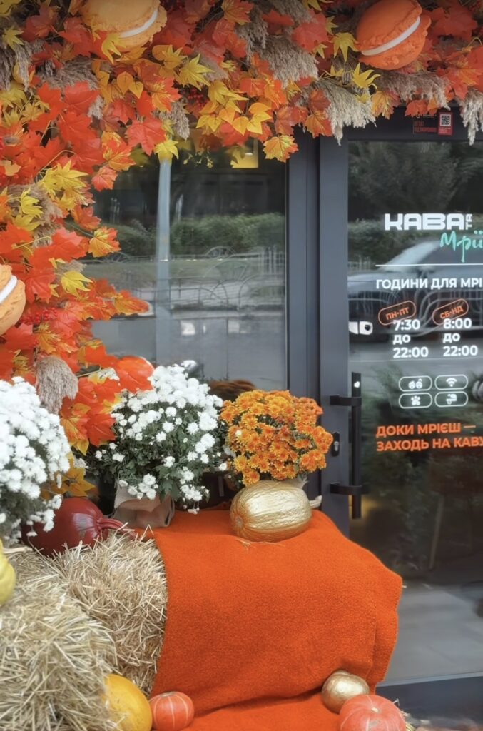 Мережа кафе-пекарень створила одні з наймасштабніших осінніх декорацій. Всі заклади з вулиці великими букетами хризантем, дерев’яними столами з пледами та іменним дзеркалом. Тут велика вітрина свіжоспеченої випічки, проте є й повноцінне меню.
