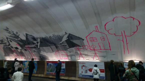 На станции «Осокорки» восемь художников из разных стран начали работать над муралом в рамках арт-проекта More than Us. Настенная роспись должна показать взгляд художников на актуальные темы, касающиеся украинского народа. И вот уже возникло первое недоразумение: киевляне возмутились из-за того, что поверх начатого черно-белого рисунка появился новый, ярко-розовый. Многие подумали, что это проделки хулиганов, которые хотят испортить мурал и даже обратились в полицию. Но как пояснил куратор проекта Гео Лерос, это задумка самого художника. В основе его рисунка — реалистичная фотография, поверху которой нарисовал ребенок.