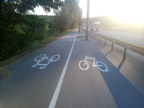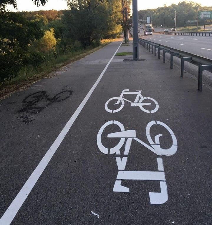 На проспекті Перемоги звернули увагу на велодоріжку, одна зі смуг якої веде у стовпи. Згодом її перемалювали: тепер велосипедистам пропонують їхати в стовпи в обидва напрямки.