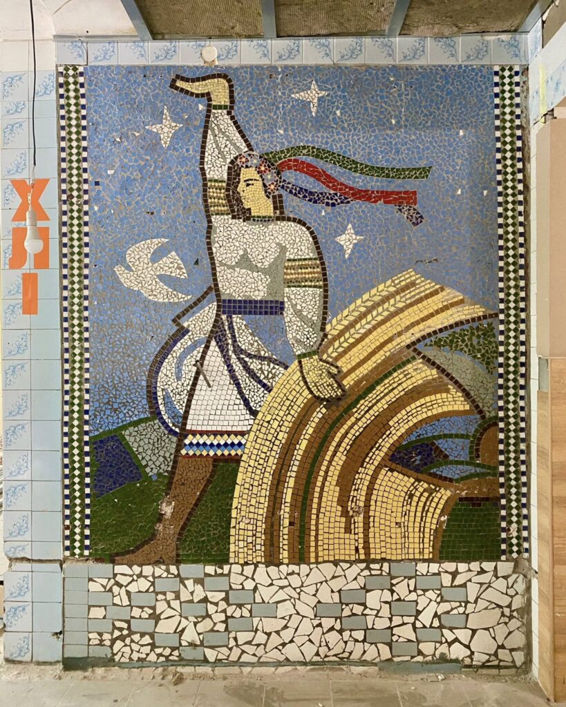 На вулиці Гроденській, 1/35 в Дарницькому районі під час ремонту під старими конструкціями знайшли мозаїку. Колись тут був гастроном, а зараз «Фора», яка зберегла та підсвітила знайдений твір.