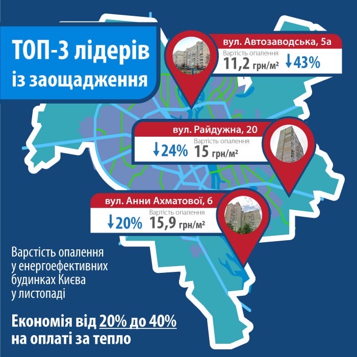 Квитанції за опалення в листопаді в енергоефективних будинках столиці менші на 20-40%, ніж в інших багатоповерхівках, що не провели енергомодернізацію в межах міських програм, повідомили в «Київтеплоенерго». За перший місяць опалювального сезону в енергоефективних будинках вартість опалення одного квадратного метра становила близько 11-16 гривень, в інших багатоповерхівках міста — в середньому 19,8 гривні за квадратний метр.