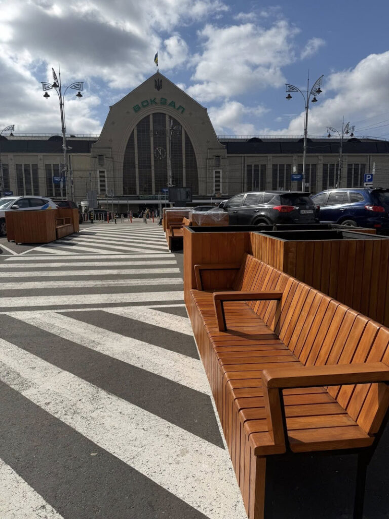Перед київським вокзалом встановили 10 парклетів на місці колишньої парковки.