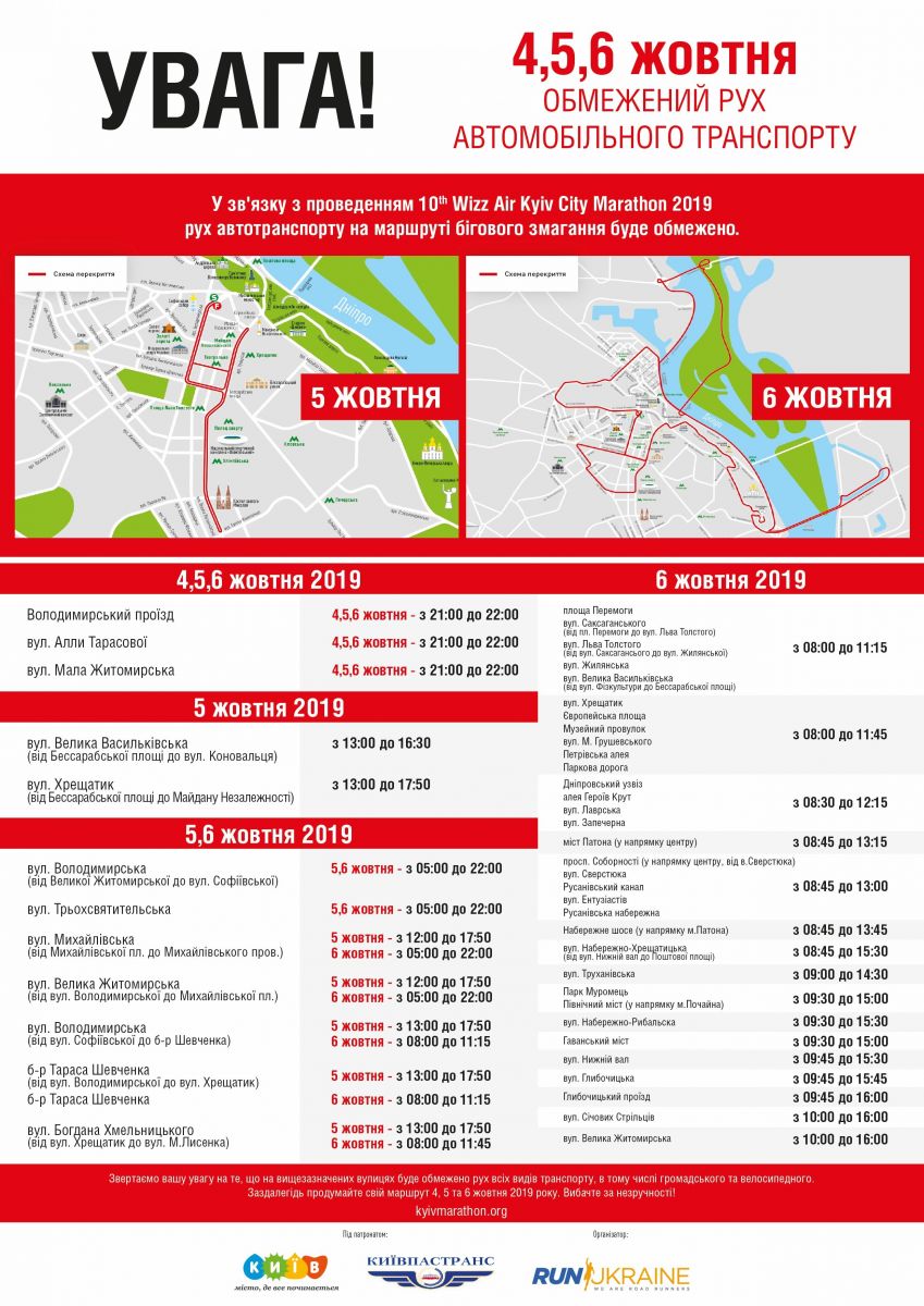 У центрі міста відбудеться масштабний забіг 10-й Київський міжнародний марафон. Тому буде перекрито ряд вулиць:
