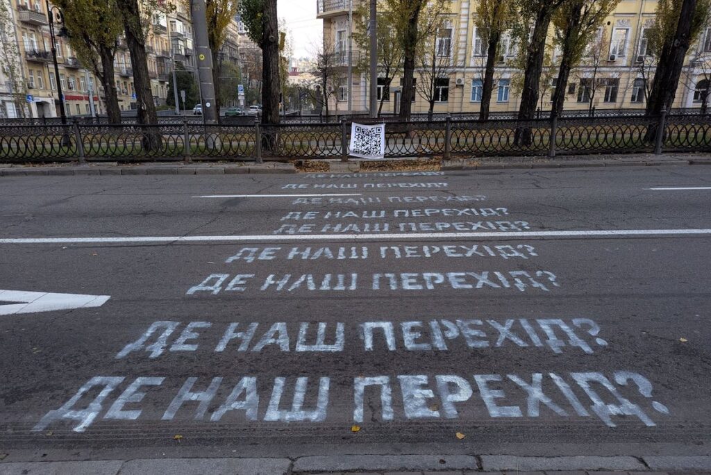 Біля станції метро «Університет» активісти намалювали імпровізований пішохідний перехід словами «Де наш перехід?»