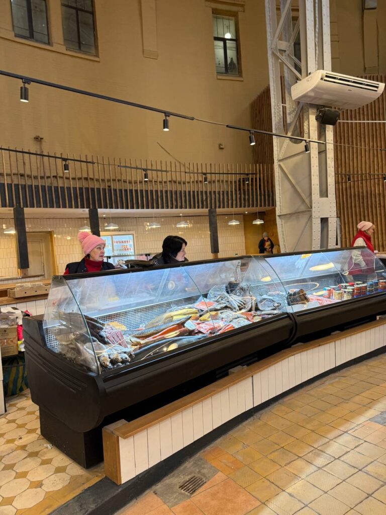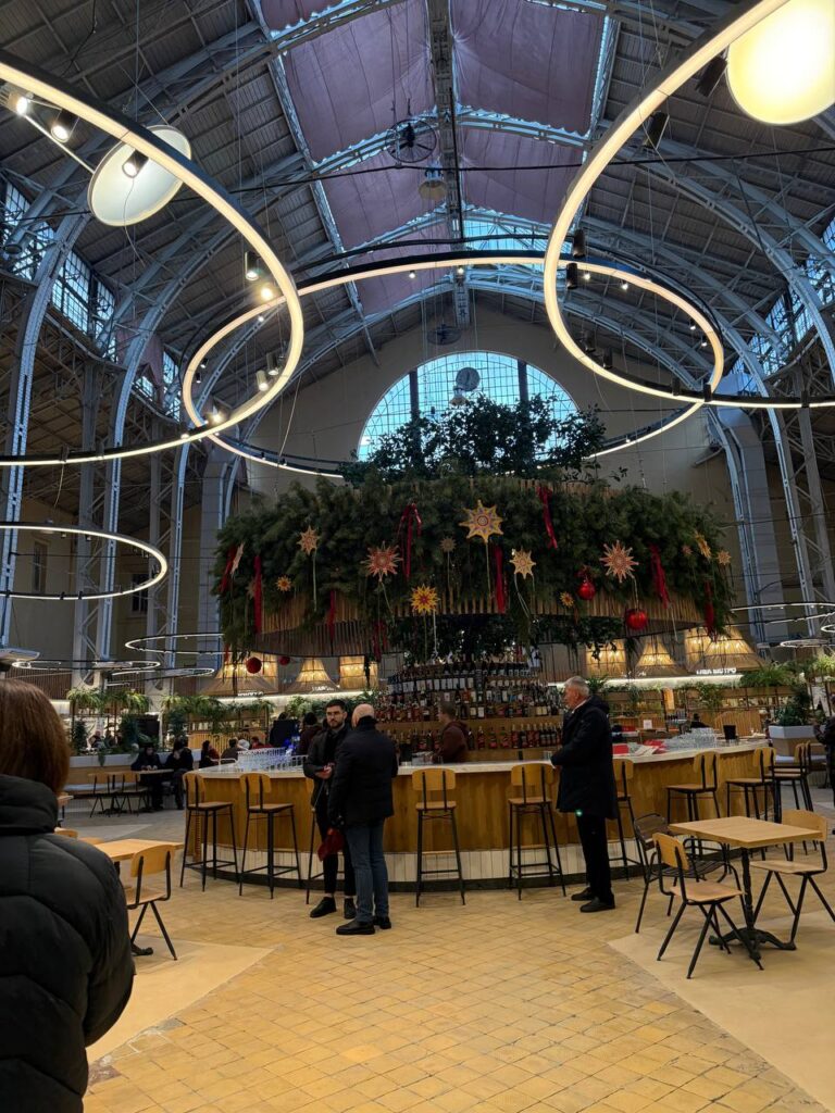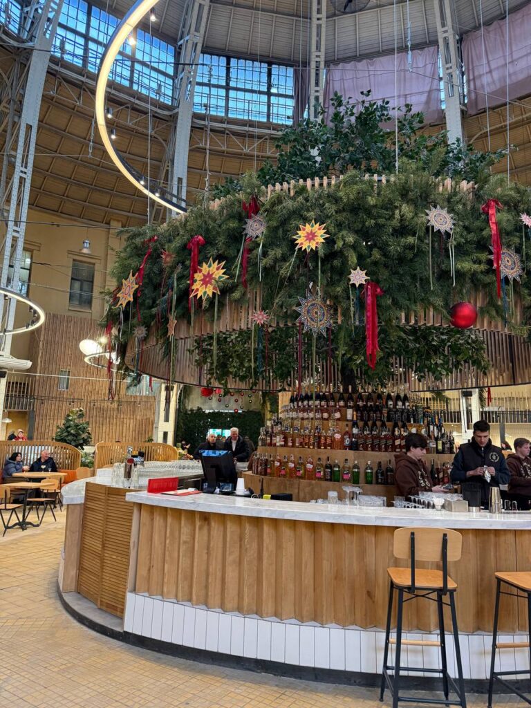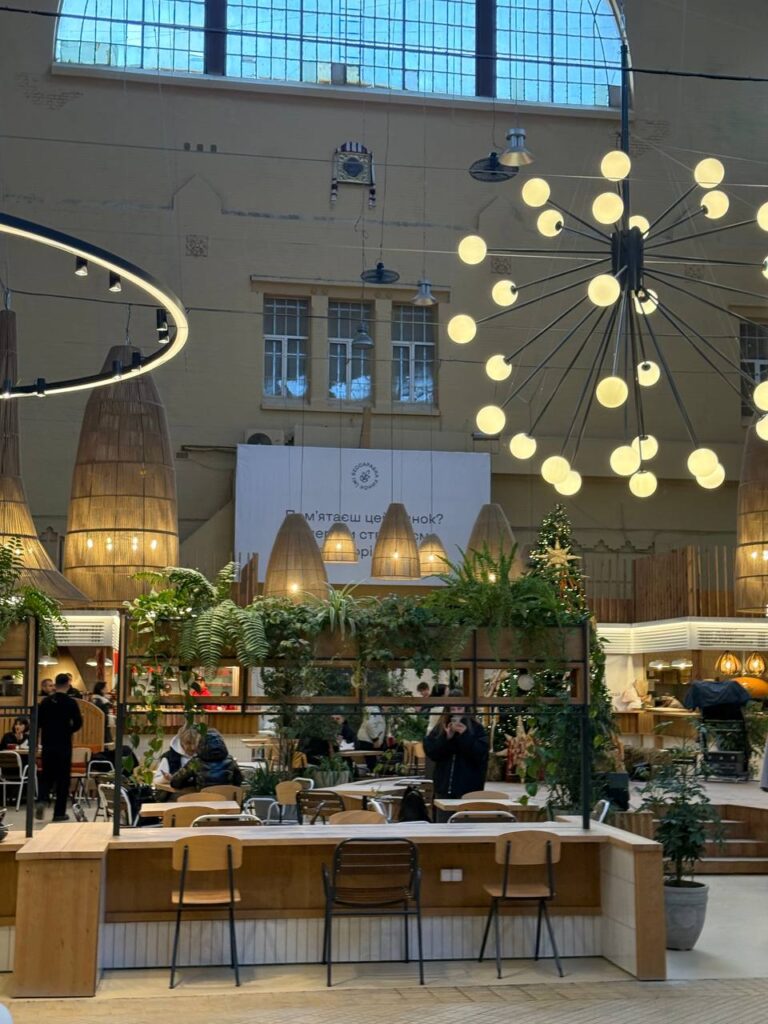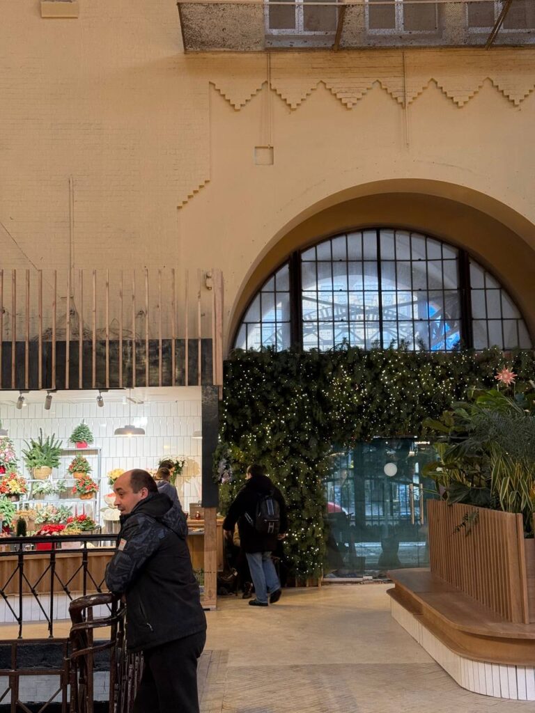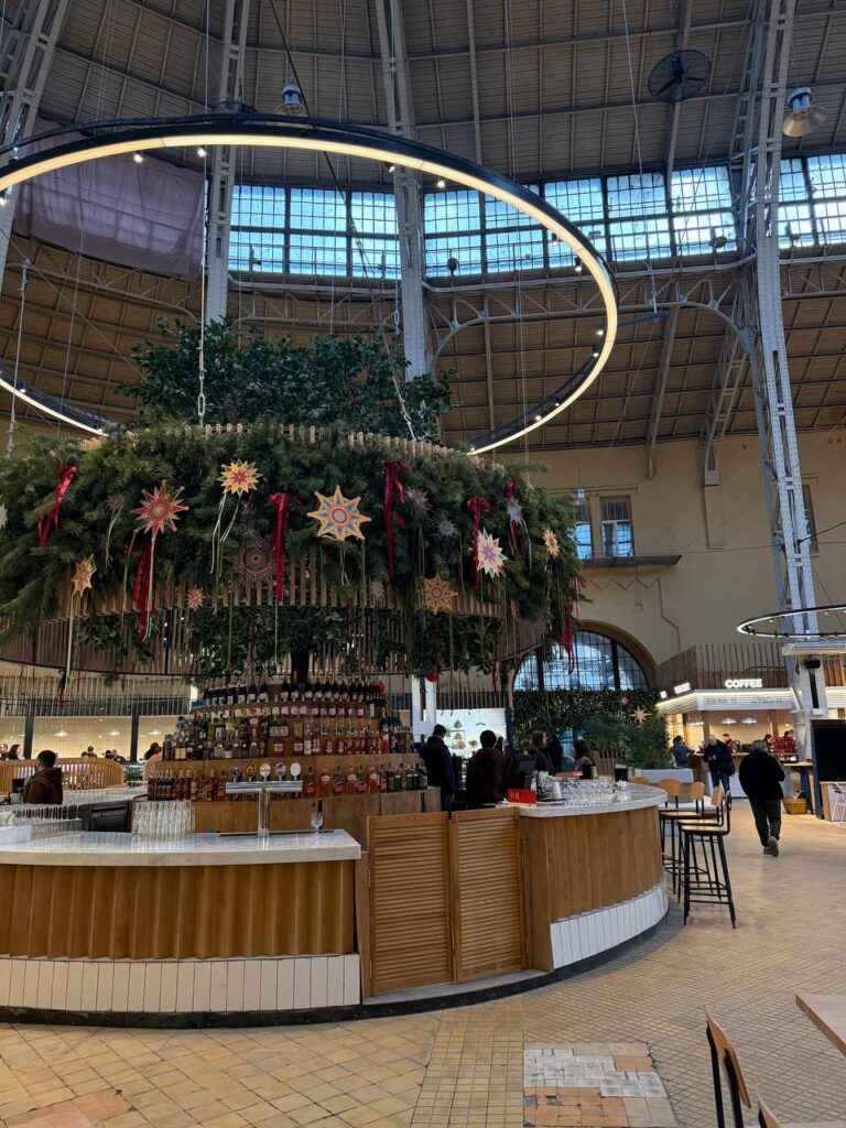 Інтер’єр визначають як футуристичний. Хоча зараз ринок виглядає різдвяним: все у вогниках, гірляндах, ялинкових гілках. Чоловіки та жінки, молодь і старші відвідувачі фотографують і роздивляються.