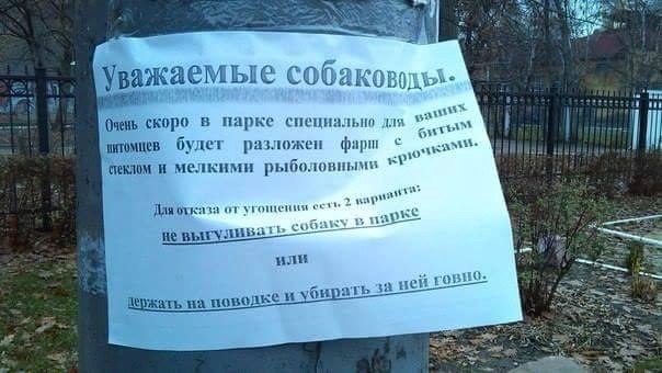 В Сырецком парке хозяевам собак угрожают — если те не будут своих питомцев держать на поводке и убирать за ними, животных накормят фаршем с битым стеклом.