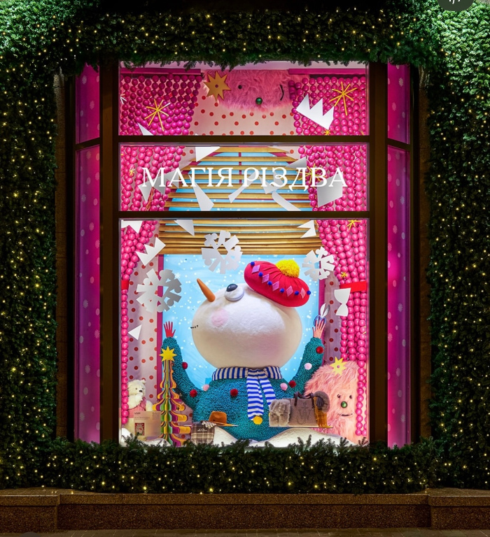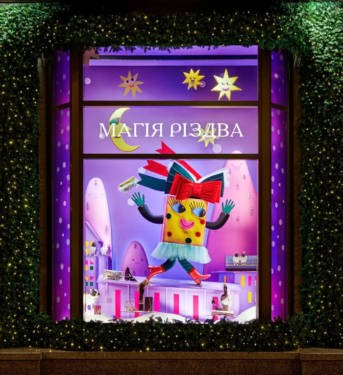 Універмаг уже традиційно оформив вітрини у святковому стилі. Цього року темою стали персонажі книжок української дитячої письменниці Грасі Олійко. Крім цього, будівлю прикрасили хвойними гілками.
