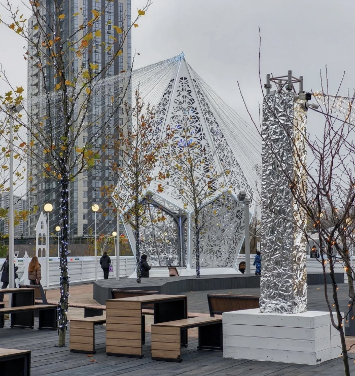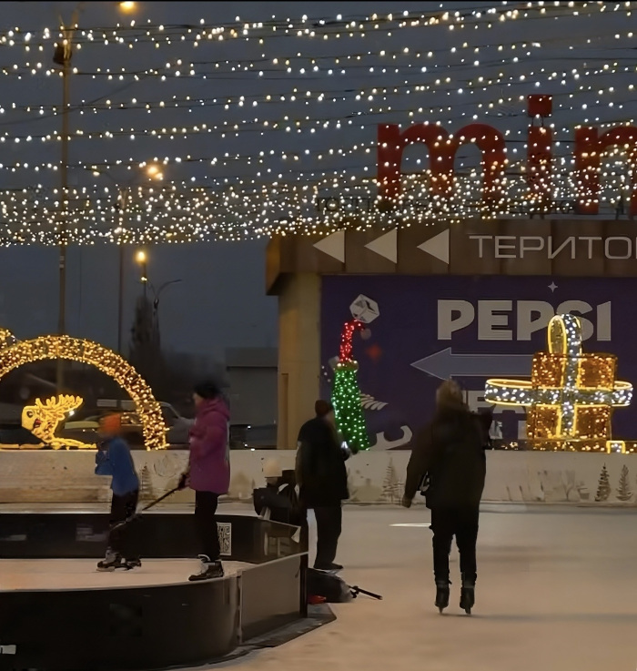 Вже другий рік поспіль тут працює «Космічна ковзанка». Посеред льоду стоїть ялинка з дзеркальних блоків, які ввечері красиво підсвічуються. А над ковзанкою повісили гірлянди — виходить ефект такого собі зоряного неба. До майданчика веде підсвічений лабіринт, а цього року ще додали дзеркальні фігури. Поруч є фудкорти з їжею та глінтвейном.