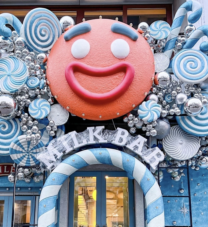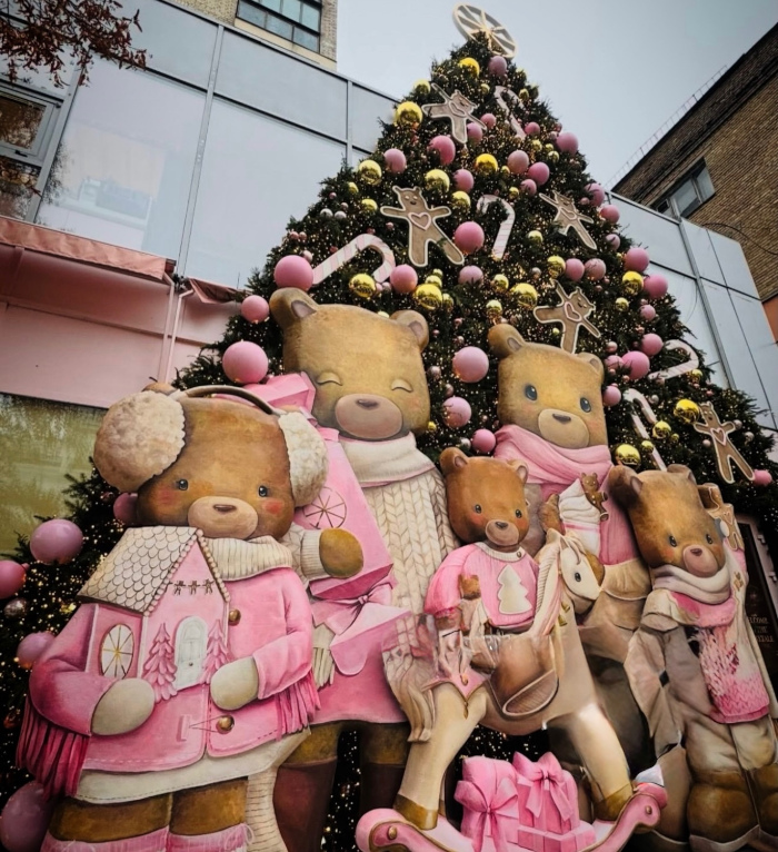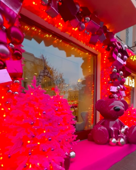 Масштабна святкова локація прикрашає цей фасад. Тут встановили велику ялинку з іграшками у формі солодощів і пряників, а поруч — декорацію з ведмежою родиною. Усе у фірмових рожевих тонах. Також у меню з’явилися святкові пряники та торти.