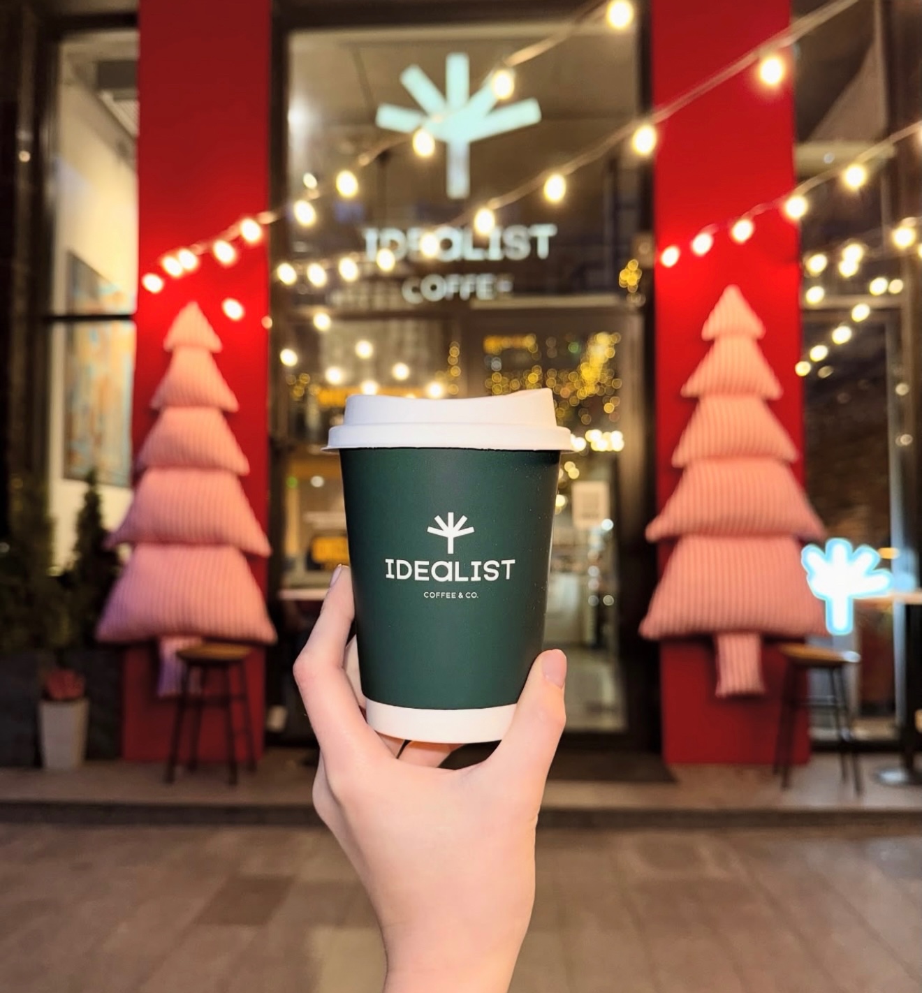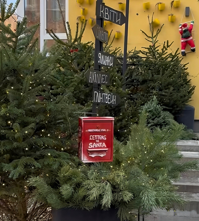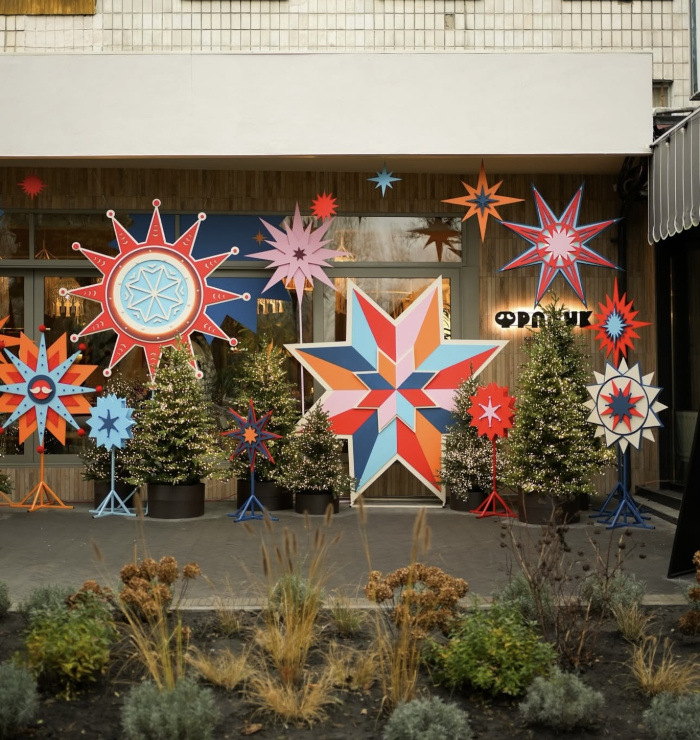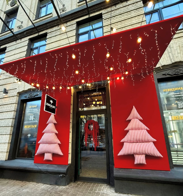 Мережа прикрасила два своїх заклади м’якими ялинками, які задумом, мають нагадувати затишні обійми. Фасад оформили у червоному кольорі, а над дверима додали гірлянди.