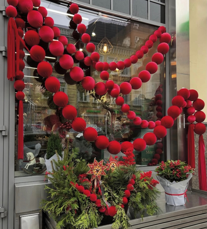 Мережа прикрасила новорічними декораціями всі свої локації, але є особлива, найнарядніша. На фасаді розвісили червоні гірлянди у формі куль, а поруч розмістили композицію з хвої та різдвяних зірок. З іншого боку великий червоний бант.