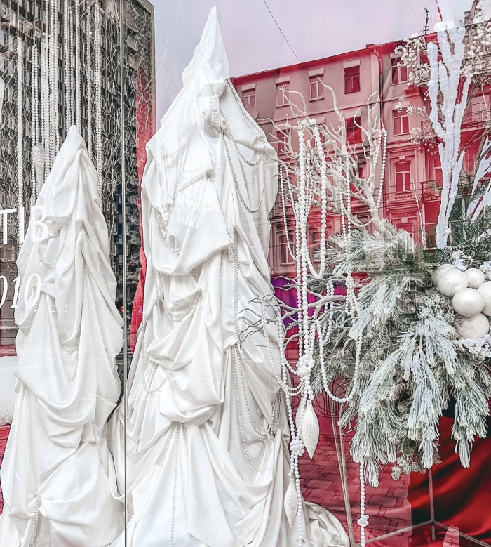 Тут встановили, мабуть, найоригінальнішу інтерпретацію ялинки. Конструкцію створили з білої тканини та оздобили перлинною гірляндою. Поруч — композиція з хвойних гілок, куль та білих декоративних гілочок. Усе розміщено на яскравому червоному тлі.