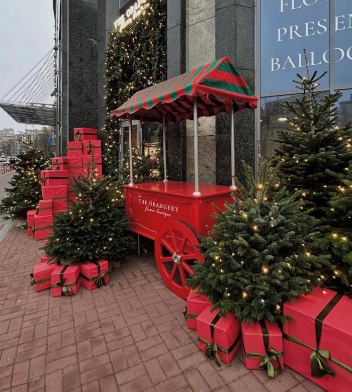 Перед входом розставили багато ялинок, прикрашених гірляндами — їх так багато, що створюється ефект парку. Проте й всередині студії новорічна тематика продовжується — можна придбати новорічні композиції, вінки та букети.