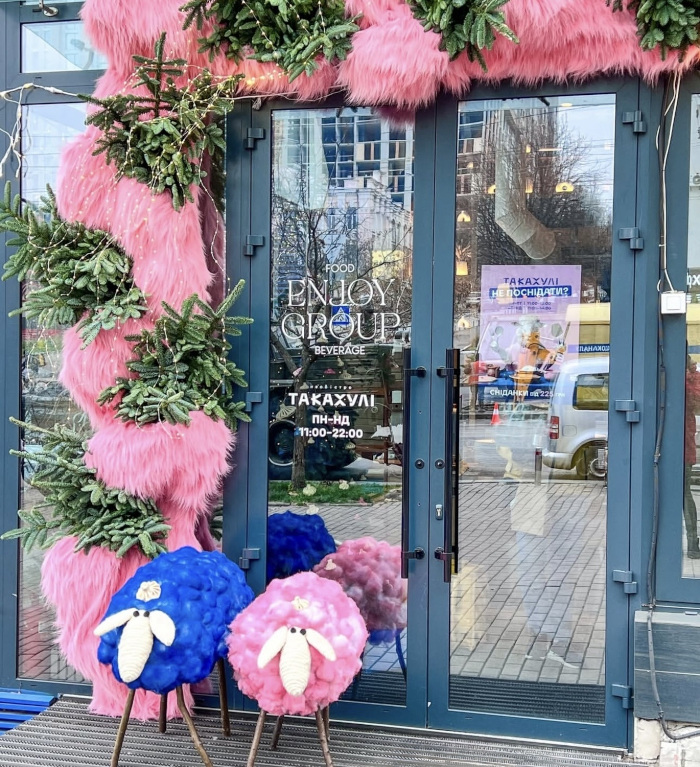 Одна з наймиліших локацій сезону. Вхід оформили пухнастою рожевою тканиною, у яку вплели хвойні гілки та гірлянди. А перед дверима поставили синіх та рожевих баранців.
