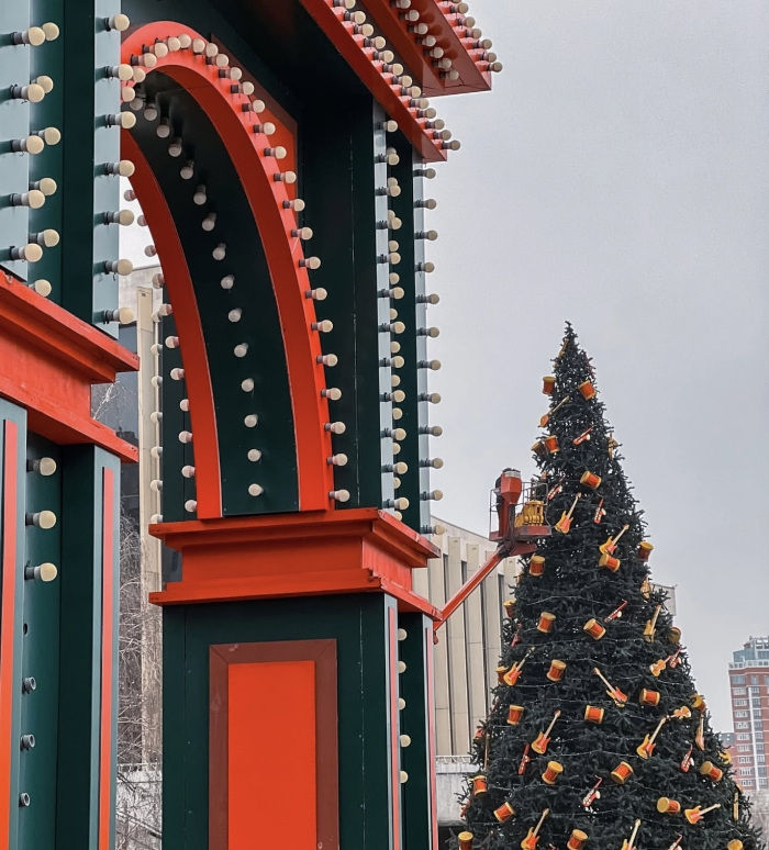 Святкова зона тут стала традицією. Цього року встановили велику ялинку, прикрашену іграшковими гітарами та барабанами. Поруч облаштували зелено-червону арку, що веде до святкової резиденції.
