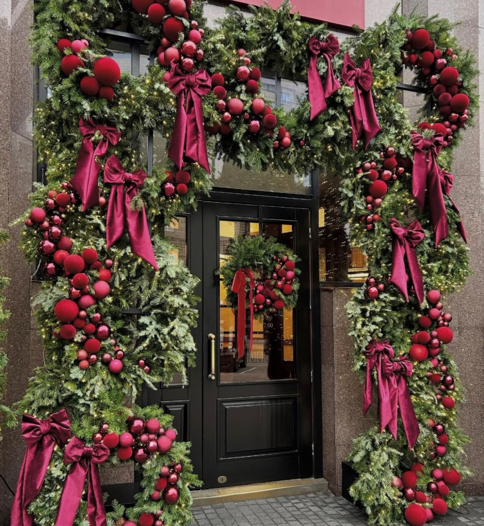 Локацію прикрасили хвойними гілками з червоними та срібними кулями. Головний акцент — великий червоний бант.