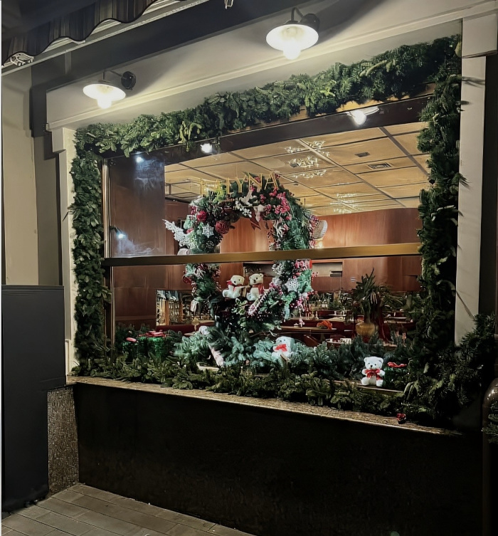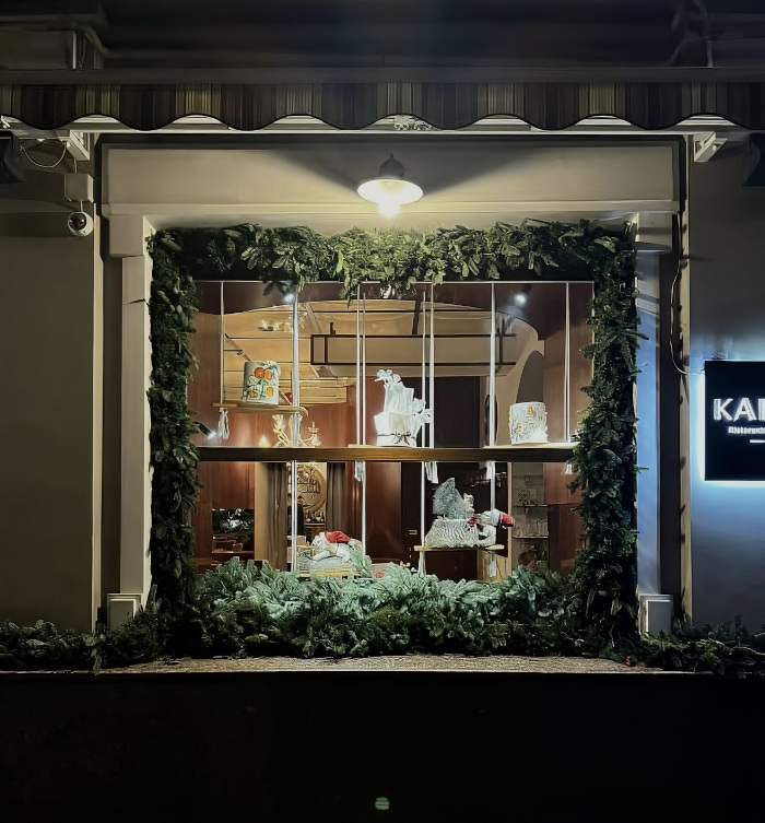 Заклад вирішив по-своєму інтерпретувати новорічну ялинку й прикрасив фасад ялинковими гілками, які підсвічуються маленькими вогниками від гірлянди. А також декорували вікна, на одне з них повісили великий вінок з плюшевими мішками. У меню також з’явилися новорічні торти, які можна замовити на виніс.