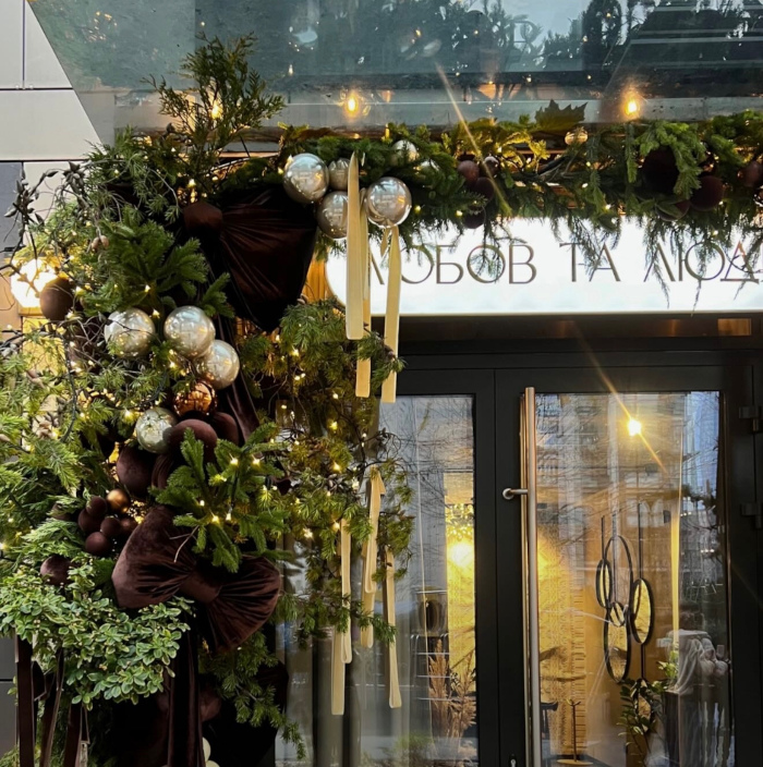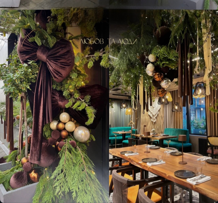 Заклад прикрасив простір і зовні, і всередині. На фасаді розмістили хвойне гілля з кулями пастельних відтінків, а зверху повісили великі банти. Всередині декор подібний — ті ж елементи розміщені на стелі.