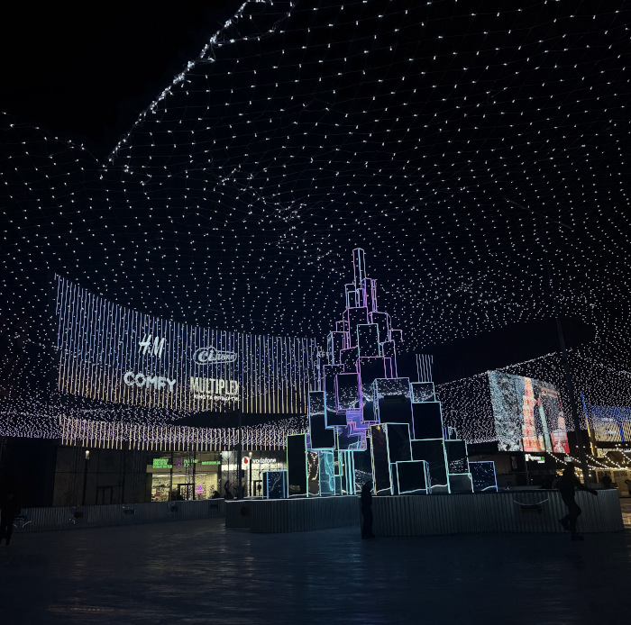 Біля цього ТРЦ теж встановили святкову інсталяцію в білому неоновому стилі. Тут стоїть 18-метрова ялинка, на якій сяють сніжинки-гірлянди. А навколо майданчика розмістили світові новорічні фігурки — оленів, фей, подарунки та сніжинки. Є ковзанка, площею 7000 м².