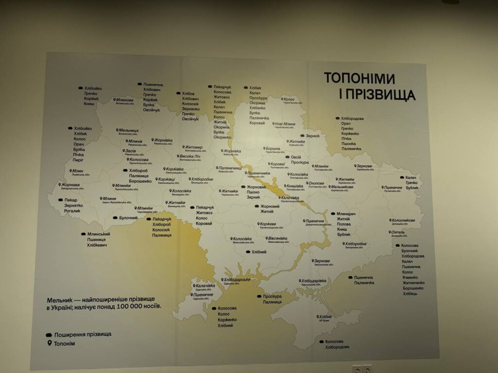 Творці виставки знайшли на мапі України назви, пов’язані з хлібом. І так само подивились на прізвища. Тепер ми знаємо, що Мельник — найпопулярніше прізвище, маємо понад 100 тисяч його носіїв. Також цікаво бачити, наскільки рівномірна карта. У кожному регіоні є щось, пов’язане з вирощуванням хліба.