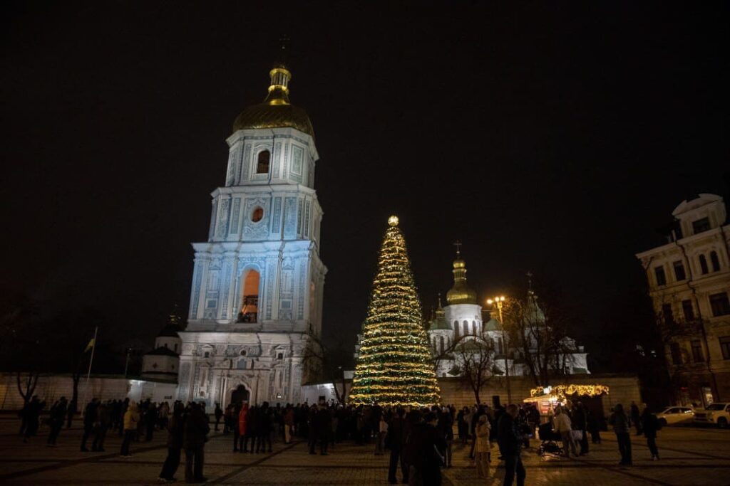 Ялинка на Софійській площі — штучне дерево 16 метрів заввишки, прикрашене в пастельних кольорах. Вибір відтінків натхненний фресками Софії Київської.