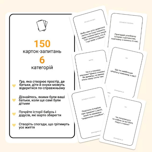Серія ігор «Між нами» підходить для того, щоб поговорити про важливе — з рідними та друзями. Наприклад, випуск «Між нами: Покоління» — набір карток для сім’ї. Запитання допоможуть згадати та поділитись важливими моментами з життя, обговорити те, до чого якось «не доходили руки». Ця гра допоможе зберегти й передати родинні історії.