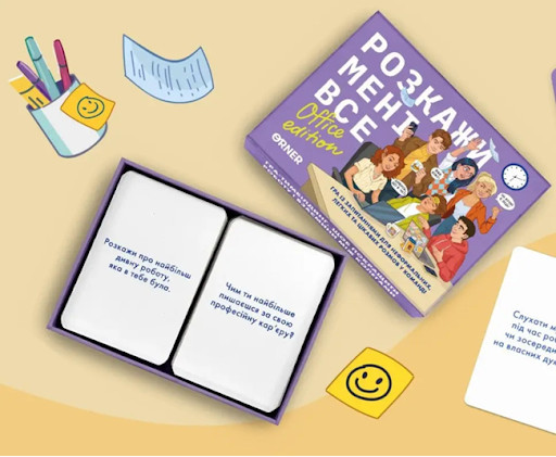 Усерії «Розкажи мені все» теж є набори для пар і сімей, а також — для колег. «Розкажи мені все! Office edition» допоможе дізнатися про колег більше, ніж ставлення до дедлайнів та улюблений колір в одязі. Менше непорозумінь — більше довіри.