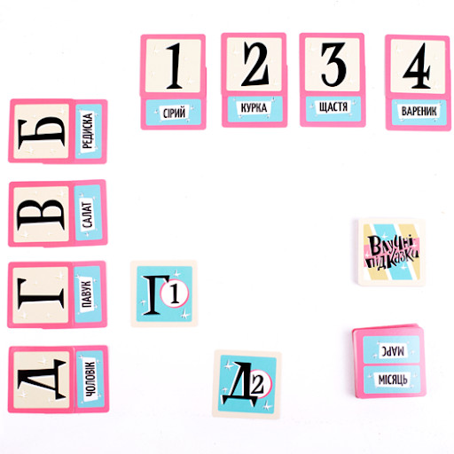 На картках зазначені різні категорії. Один гравець вибирає картку й читає назву категорії. Тепер у всіх гравців є хвилина, щоб згадати і написати якнайбільше слів на кожну літеру алфавіту. Наприклад, якщо на картці написано «В супермаркеті», потрібно записати в алфавітному порядку те, що можна побачити в супермаркеті: «Авокадо», «Батон», «Вино», «Груша»… Що більше напишете, то більше балів заробите.
