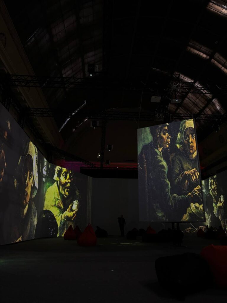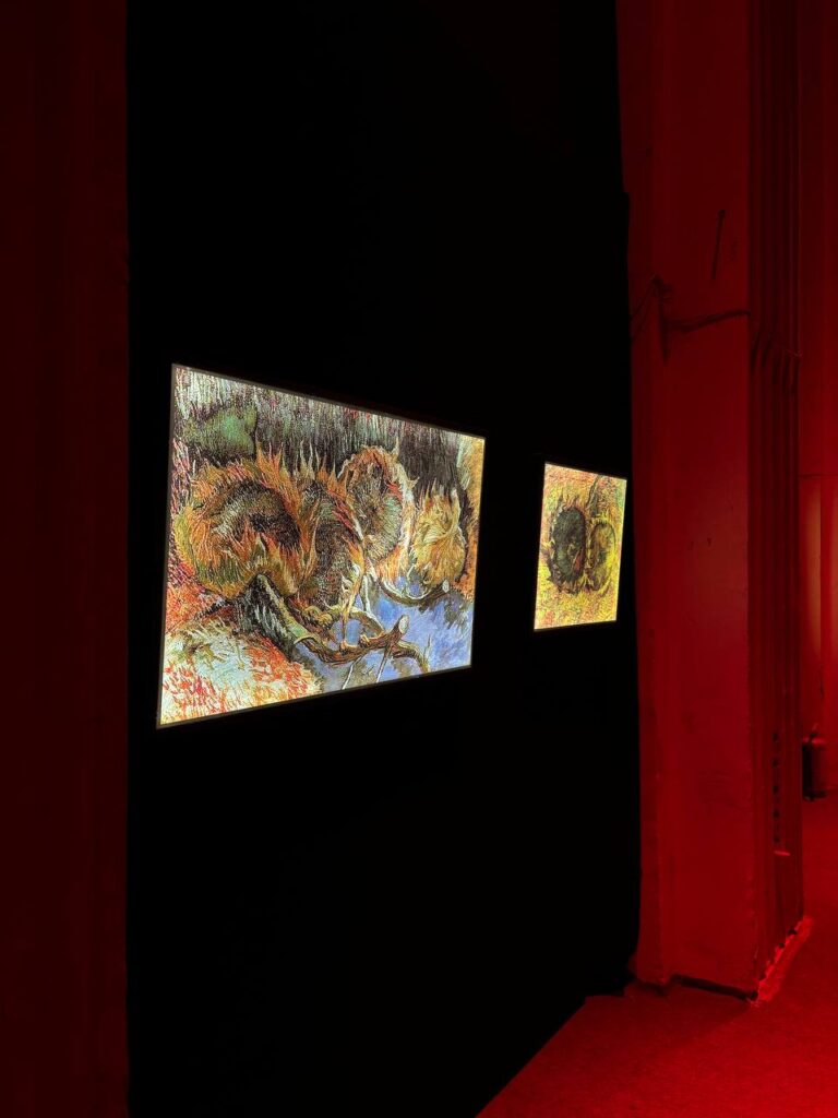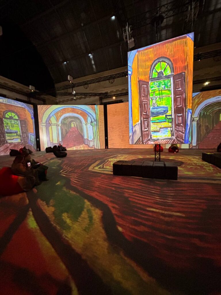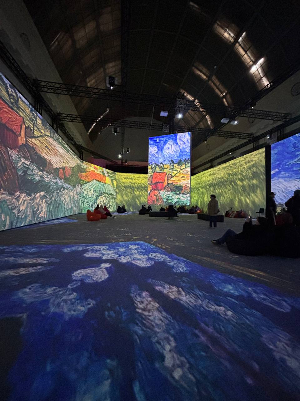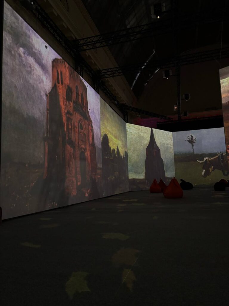 Виставка імерсивна, що з англійської означає «занурення». Ми наче потрапляємо в змодельовану реальність. У великій залі можна розташуватися на пуфах чи кріслах-мішках і спостерігати, як на стінах та підлозі відтворюються вангогівські картини. Все це під музику та цитати з листів до Тео. Цікавий, навіть медитативний досвід.