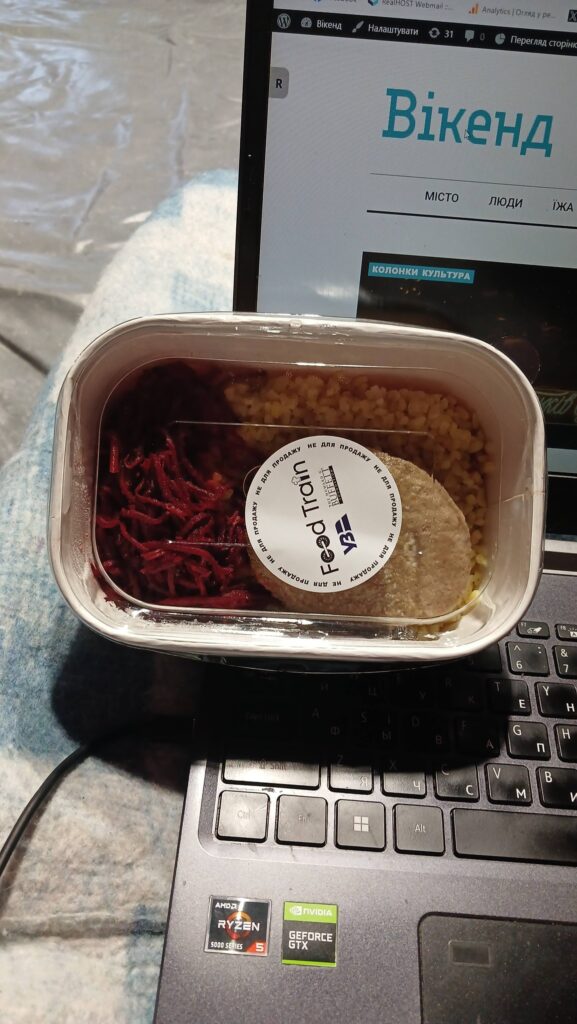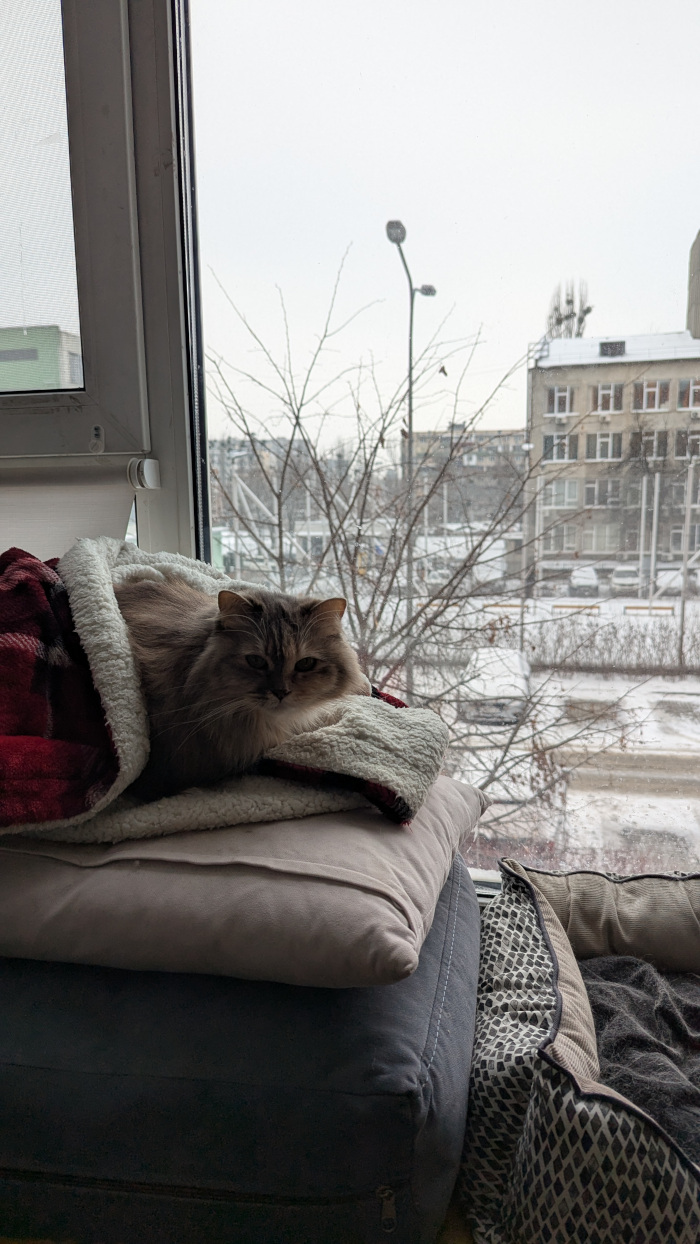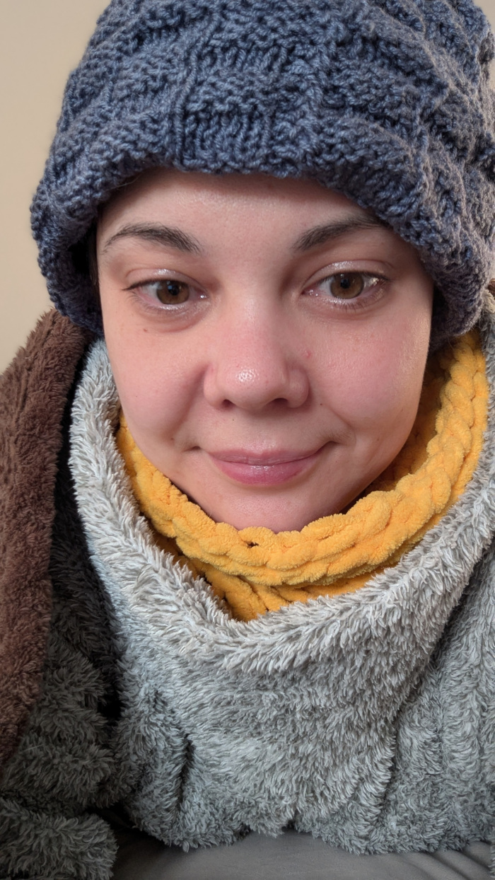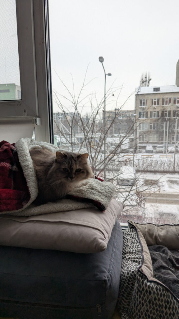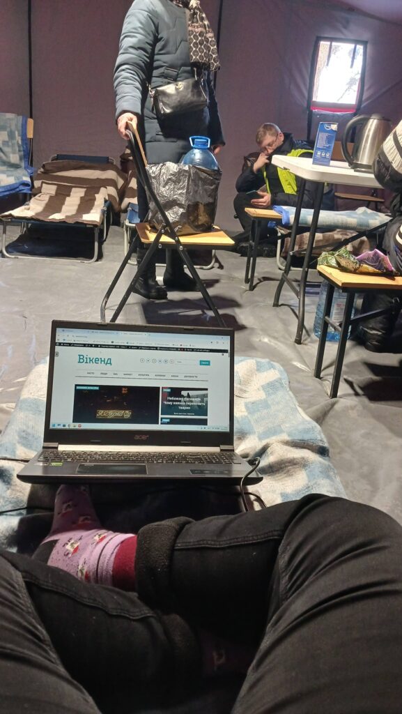 Багато шарів одягу, включаючи термобілизну. Оце все: футболка, кофта, ще кофта, дві-три пари штанів, дві пари шкарпеток, інколи ще й халат. Я утеплювалася, як могла. Мерзну, якщо навіть трохи піддуває в шию, тому в хід пішов веселий жовтий снуд, холодні вуха зігрівала шапкою. Найнезручніше — те, що мерзнуть руки, коли працюєш за ноутом, а в рукавичках працювати складно.
