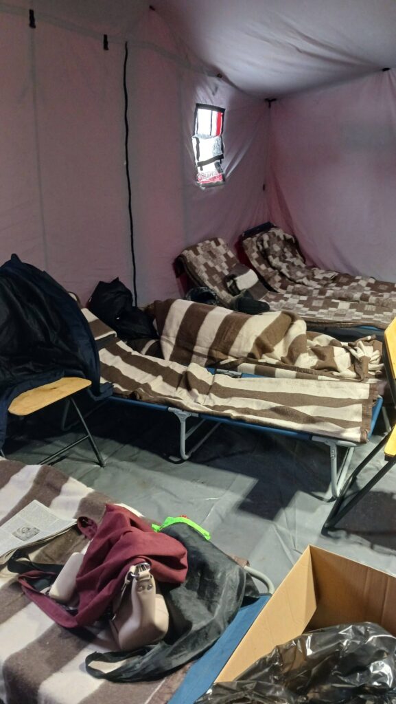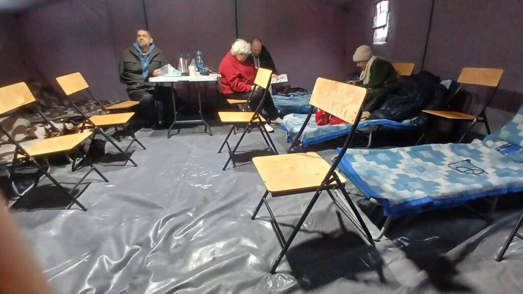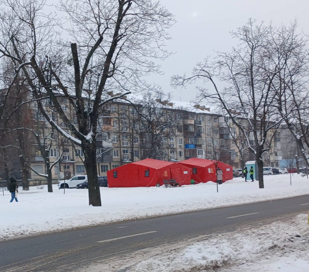 Намети рятувальників. Їх чимало по району. Там є тепло, світло, можна сидіти, лежати, працювати, на столі стаканчики, вода, чайник, чай та печиво. Можна зарядити гаджети. Важливе питання про вбиральню: кабінки біотуалетів встановлені на вулиці біля наметів.