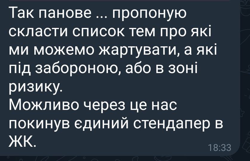 — У нас найкращий чат ЖК, такого вайбу точно ніде немає. Хоча патерн всюди однаковий: є 10–15% людей, які постійно щось пишуть, десь 3% із них — дуже смішні або притрушені. Ще 20% мовчки читають і лайкають першу категорію, а решта 70% — щасливі люди. Хоча є окрема категорія — це ті, кого немає в чаті. Насправді треба прагнути бути такою людиною.